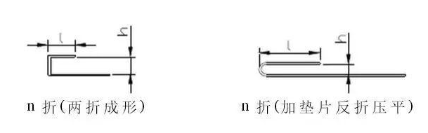 N折成形時依據(jù)l及h尺寸值而采取不同的加工方式,一種是直接分為兩折成型,另一種是加墊片反折壓平,一般情況下,N折中的H為較重要尺寸。