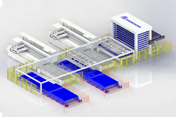 自動(dòng)化上下料系統(tǒng)+自動(dòng)切割系統(tǒng)又可以和前端的自動(dòng)料庫系統(tǒng)、后端的AGV物流系統(tǒng)、自動(dòng)折彎系統(tǒng)、自動(dòng)焊接系統(tǒng),乃至后續(xù)的表面處理系統(tǒng)結(jié)合成全自動(dòng)化的鈑金生產(chǎn)線。