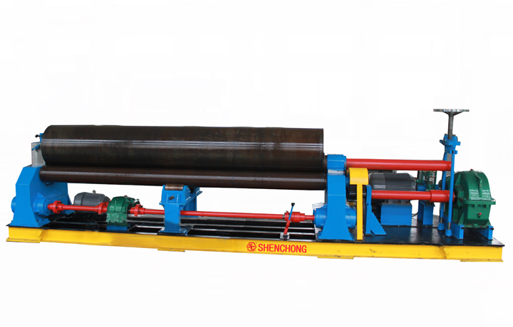 卷板機上輥在兩下輥中央對稱位置通過液壓缸內(nèi)的液壓? 油作用于活塞作垂直升降運動通過主減速機的末級齒輪帶